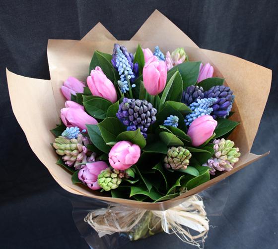 Simply beautiful scented hyacinths and tulips spring fresh bouquet! (colours may vary with availability)