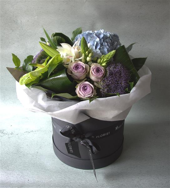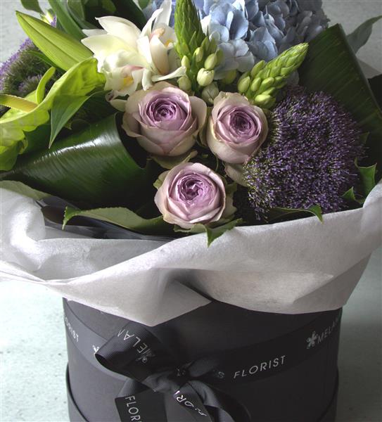 Step out in style with our luxury Hatbox range! Our finest quality hatbox, complete with lid, finished with fabric wrapping and our luxury Melanies Florist ribbon.
