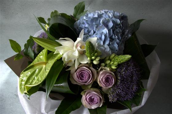 A compact arrangement includes roses, orchids, anthurium and rolled leaves in shades of lavender, purple and green.