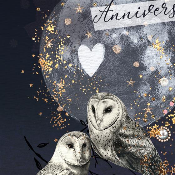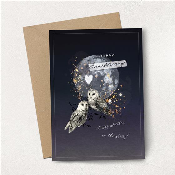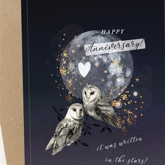 This greetings card features two illustrated owls under the moon and stars, paired with beautiful glitter effect detailing. Hand stamped with eco-friendly, glitter effect foil. Caption reads: ‘Happy Anniversary! It was written in the stars!’.
