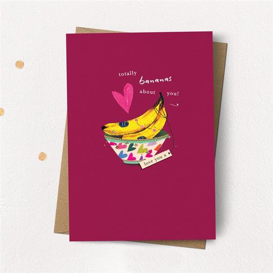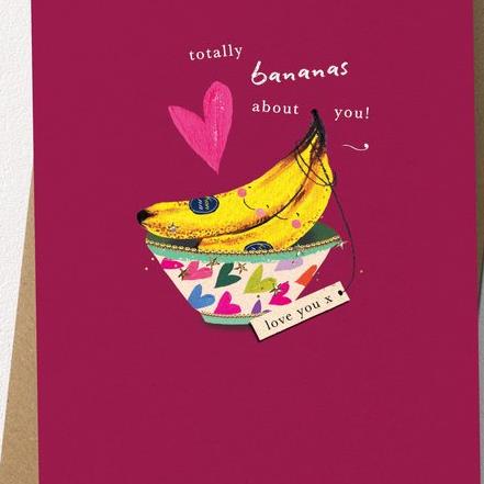This greetings card features painted bananas in a bowl with the caption ‘Totally Bananas About You’. Finished with eco-friendly foil.