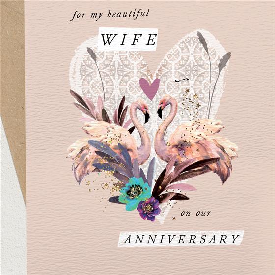 This greetings card features the caption ‘Beautiful Wife on our Anniversary’. Hand stamped with eco-friendly recyclable foil.