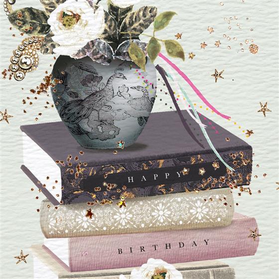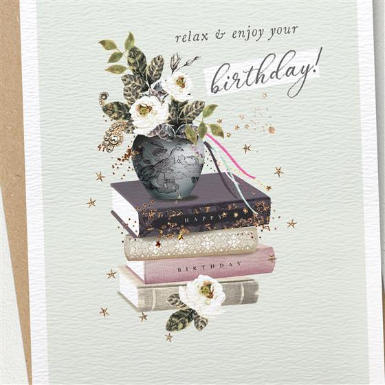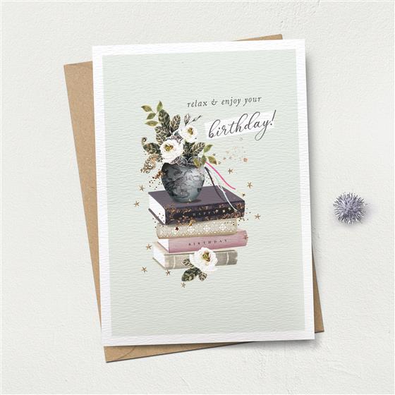 This greetings card features a stack of books and bouquet of flowers. Caption reads ‘Relax & Enjoy Your Birthday!’. Hand stamped with eco-friendly glitter effect foil.