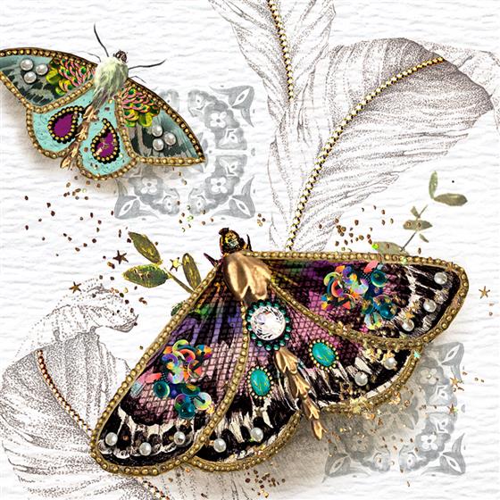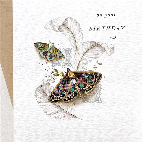 This greetings card features ornate, decorated butterflies with the caption ‘On your birthday’. Embellished with a crystal and stamped with eco-friendly recyclable foil.