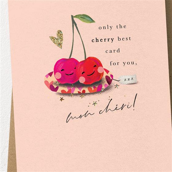 This greetings card features painted cherries on a plate with the caption ‘Only the Cherry Best Card for You, Mon Cheri!. Finished with eco-friendly foil.