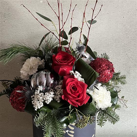 Add a touch of luxury to your holidays with this Festive Christmas Hat Box Arrangement from Melanie’s Florist. Designed in a stylish “Merry Christmas” hat box, this elegant holiday floral display features vibrant red roses, white carnations, fresh evergreens, and sparkling festive ornaments. Accented with seasonal berries, eucalyptus, and holiday twigs, this design brings sophistication and cheer to any space.