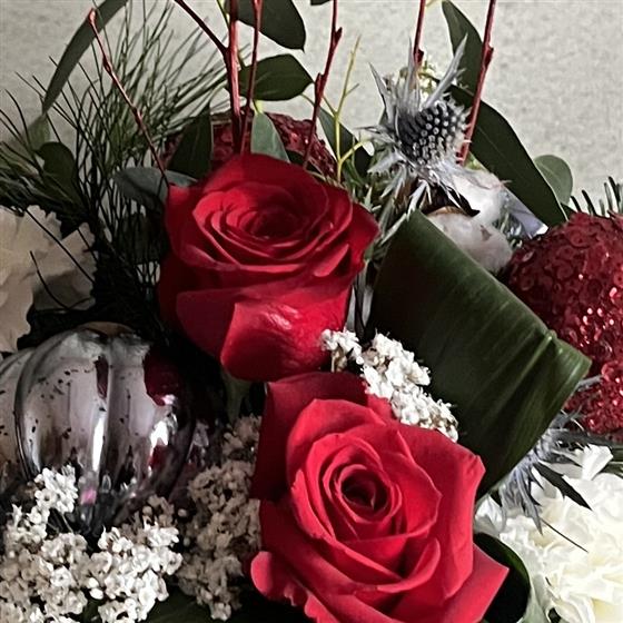 Perfect as a Christmas centerpiece, holiday gift, or winter home decoration, this arrangement captures the magic of the season with timeless red-and-white blooms and a modern presentation.