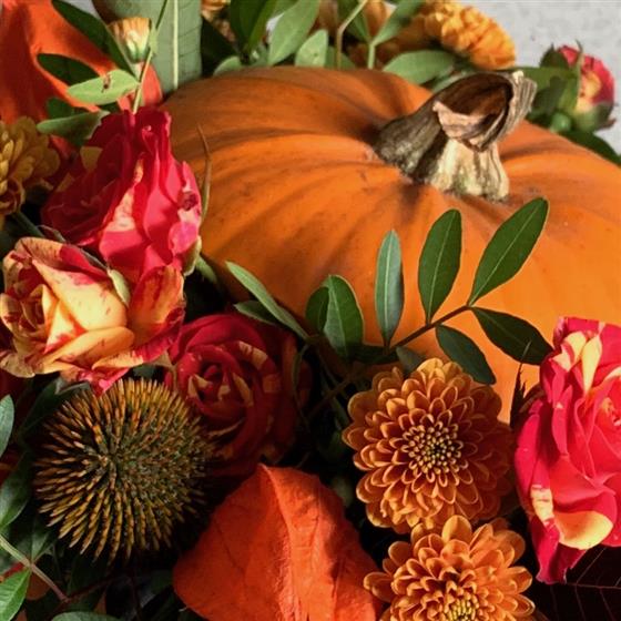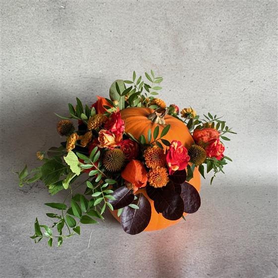 *PLEASE PLACE THE ARRANGEMENT ON A PROTECTED SURFACE AS THE PUMPKIN IS A NATURAL FRUIT AND WILL DECOMPOSE OVER TIME*