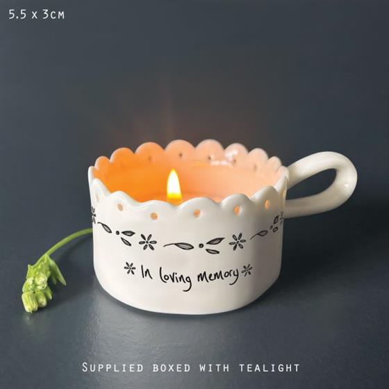 Create a peaceful and comforting atmosphere with the Scallop Handled Tea Light Holder by East of India, delicately engraved with the words ‘In Loving Memory’. Perfect for honouring cherished memories and adding a gentle glow to your home, this elegant porcelain piece makes a thoughtful sympathy gift or remembrance keepsake. Beautifully crafted with a timeless design, it’s a heartfelt way to keep loved ones close. Shop now for a candle holder that brings warmth and meaning.