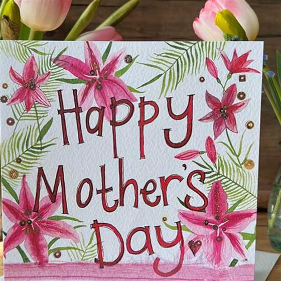 Say Happy Mother’s Day in a timeless way with this elegant Alex Clarke floral greeting card. The front reads “Happy Mother’s Day” surrounded by beautiful oriental pink lilies, while the inside is blank so you can write a personal message from the heart. A 160mm square card supplied with a white hammer envelope, perfect for mums, grandmas, and mother-figures who love flowers.