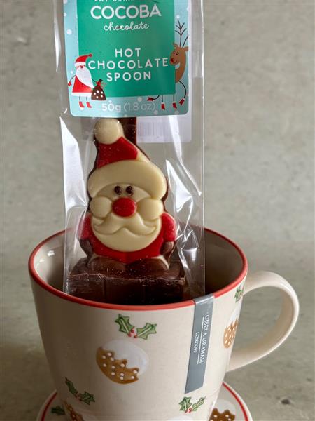 To make your hot chocolate ritual even more indulgent, each set includes a premium Cocoba milk-chocolate stirring spoon, crafted from the highest-quality chocolate and topped with a cheerful Santa or snowman character. Simply swirl the chocolate spoon into hot milk to create a rich, velvety drink that captures the magic of Christmas in every sip.