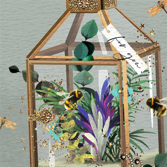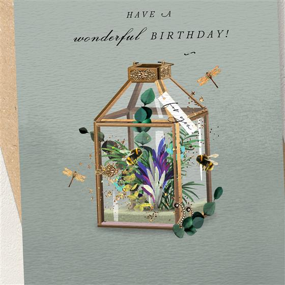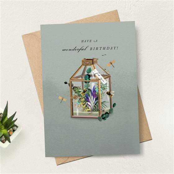 This greetings card features an ornate gold lantern with various plants inside with the caption ‘Have a wonderful birthday!’. Hand stamped with eco-friendly recyclable foil.