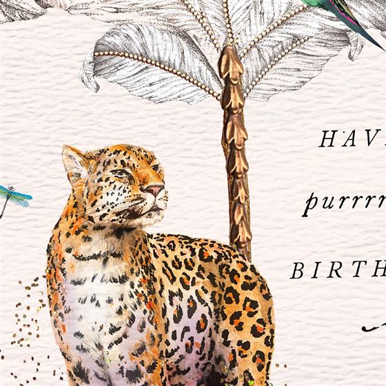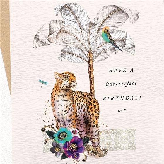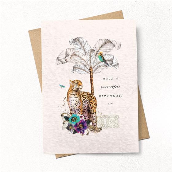 This greetings card features a painted leopard and bird with the caption ‘Have a purrrrrfect birthday!’. Hand stamped with eco-friendly recyclable foil.
