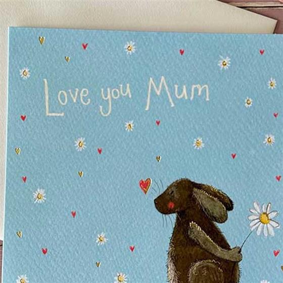 Send a sweet message this Mother’s Day with this adorable Alex Clarke greeting card, featuring the words “Love You Mum” alongside a cute rabbit, surrounded by daisies and tiny heart details dotted across the design. The charming illustration makes it a truly heart‑warming card. Blank inside so you can add your own personal message. A 160mm square card supplied with a white hammer envelope, and printed in the UK — ideal for mums who love cute, floral designs.