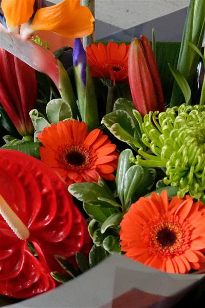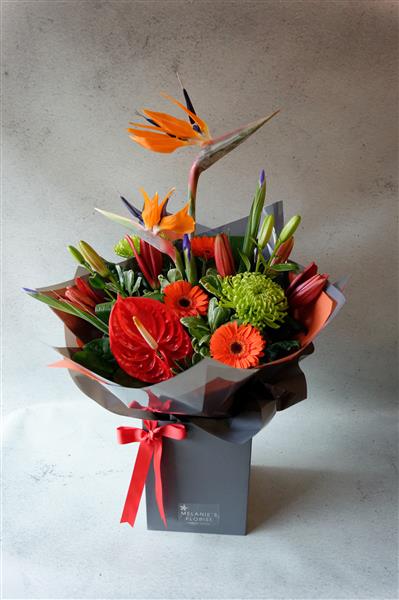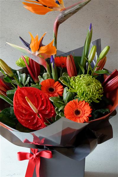 A vibrant handtied bouquet, full of stunning tropical flowers. The design Includes Strelitzia, anthuriums and a mixture of complimentary flowers. Guaranteed the wow factor!