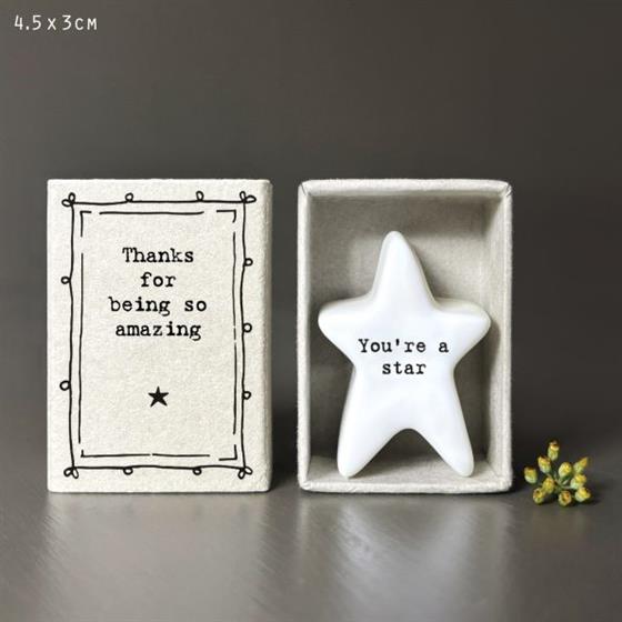 Show your appreciation with the Matchbox Porcelain Star by East of India, featuring the uplifting message: ‘Thanks for being amazing’ printed on the box. This beautifully crafted keepsake is the perfect way to say thank you to friends, family, colleagues, or anyone who deserves recognition. Thoughtful, elegant, and easy to gift, it’s a small token that makes a big impact. Shop now for a piece that celebrates kindness and gratitude!