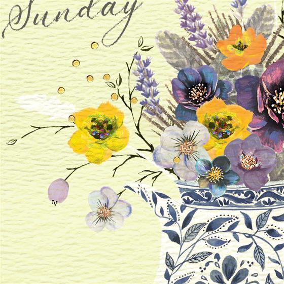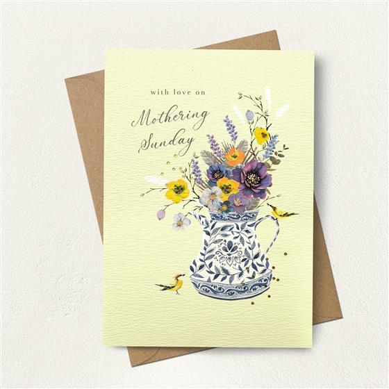 this greetings card features a painted vase of bright blooms with the caption ‘With Love on Mothering Sunday’. This card is hand stamped with eco-friendly foil to add a touch of luxury.