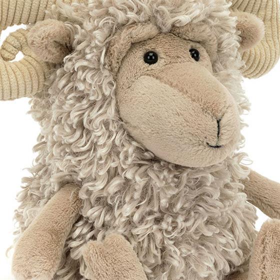 Ramsley Sheep is the littlest bighorn in the herd. With a coat of tousled, textured beige fur and soft beige limbs with cloven hooves, Ramsley has an expressive face and large, curly cord horns. The perfect companion for any hiker or wanderer.