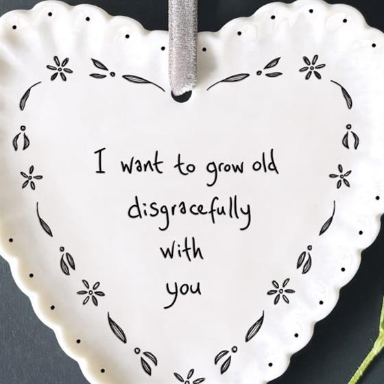 Add a playful touch to your home with this beautifully handcrafted scallop-edged porcelain hanging heart by East of India. Engraved with the cheeky words: “I want to grow old disgracefully with you”, this charming piece is perfect for couples who love to laugh and live life to the fullest. Ideal as a romantic gift for anniversaries, Valentine’s Day, or just because, it’s a keepsake that blends humour with heartfelt sentiment.