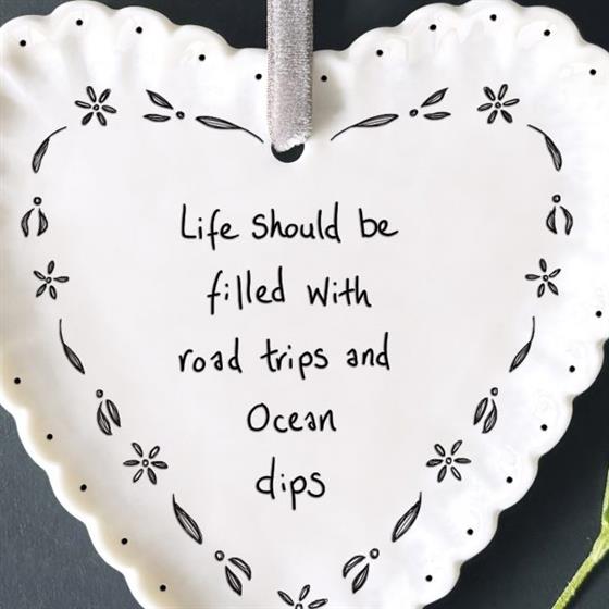 Celebrate life’s adventures with this beautifully handcrafted scallop-edged porcelain hanging heart by East of India. Engraved with the uplifting words: “Life should be filled with road trips and ocean dips”, and adorned with delicate flowers around the edging, this piece is perfect for those who love travel and seaside escapes. Ideal as a thoughtful gift for birthdays, housewarmings, or simply to inspire wanderlust, this elegant keepsake adds a touch of coastal beauty and meaning to any space. Shop now for a timeless treasure that captures the spirit of adventure!