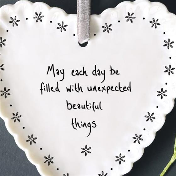 Brighten every day with this beautifully handcrafted scallop-edged porcelain hanging heart by East of India. Engraved with the uplifting words: “May each day be filled with unexpected beautiful things”, this elegant piece is perfect for adding inspiration to your home décor or gifting to someone special. A timeless keepsake that radiates hope and happiness, it’s ideal for birthdays, housewarmings, or simply to spread joy.