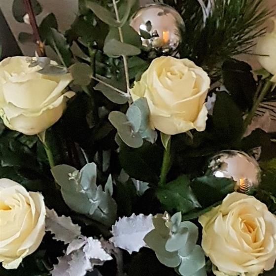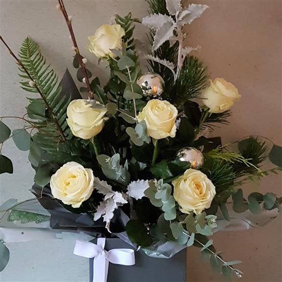 A romantic festive bouquet of white roses and sumptuous foliages, finished with baubles and presented in our special Christmas wrapping.