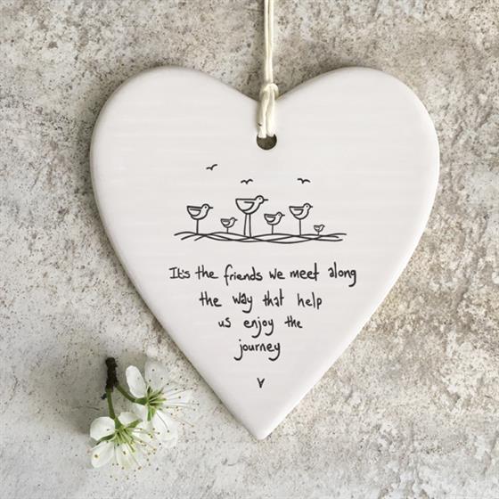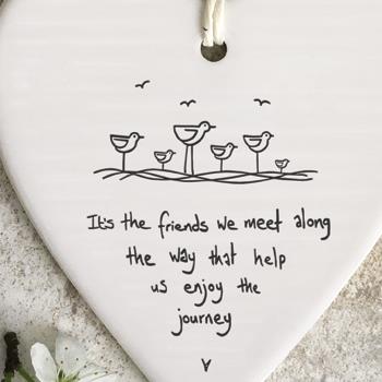 Add a touch of charm and meaning to your home with this beautifully handcrafted wobbly round hanging heart by East of India. Engraved with the heartfelt words: “It’s the friends we meet along the way that help us enjoy the journey”, and adorned with delicate birds, this piece is perfect for celebrating friendship and togetherness. Ideal as a thoughtful gift for birthdays, housewarmings, or simply to show appreciation, this elegant keepsake brings warmth and sentiment to any space. Shop now for a timeless treasure that honours the bonds that make life special!