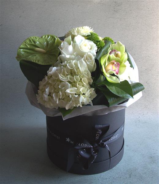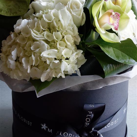 Step out in style with our luxury Hatbox range! Our finest quality hatbox, complete with lid, finished with fabric wrapping and our luxury Melanies Florist ribbon.