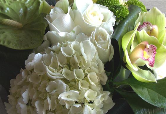 A compact arrangement includes roses, orchids, anthurium, rolled leaves and hydrangeas in neutral shades of ivory and green.