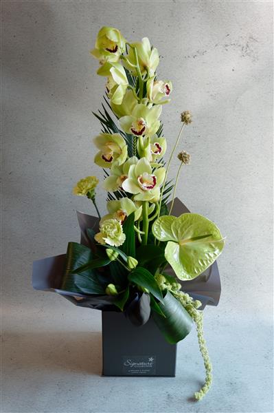 At its heart sits a show-stopping cymbidium orchid, paired with sculptural anthuriums and glossy rolled aspidistra leaves for bold texture and architectural elegance. Accented with complementary seasonal blooms such as lilies, the arrangement offers movement, height, and a sophisticated modern finish.